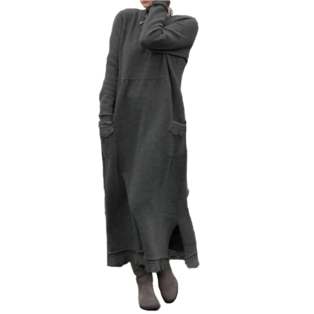 Oplev den perfekte kombination af stil og komfort med denne maxi kjole, der holder dig varm og elegant hele dagen. Denne kjole er ideel til både afslappede dage derhjemme og udendørs eventyr.