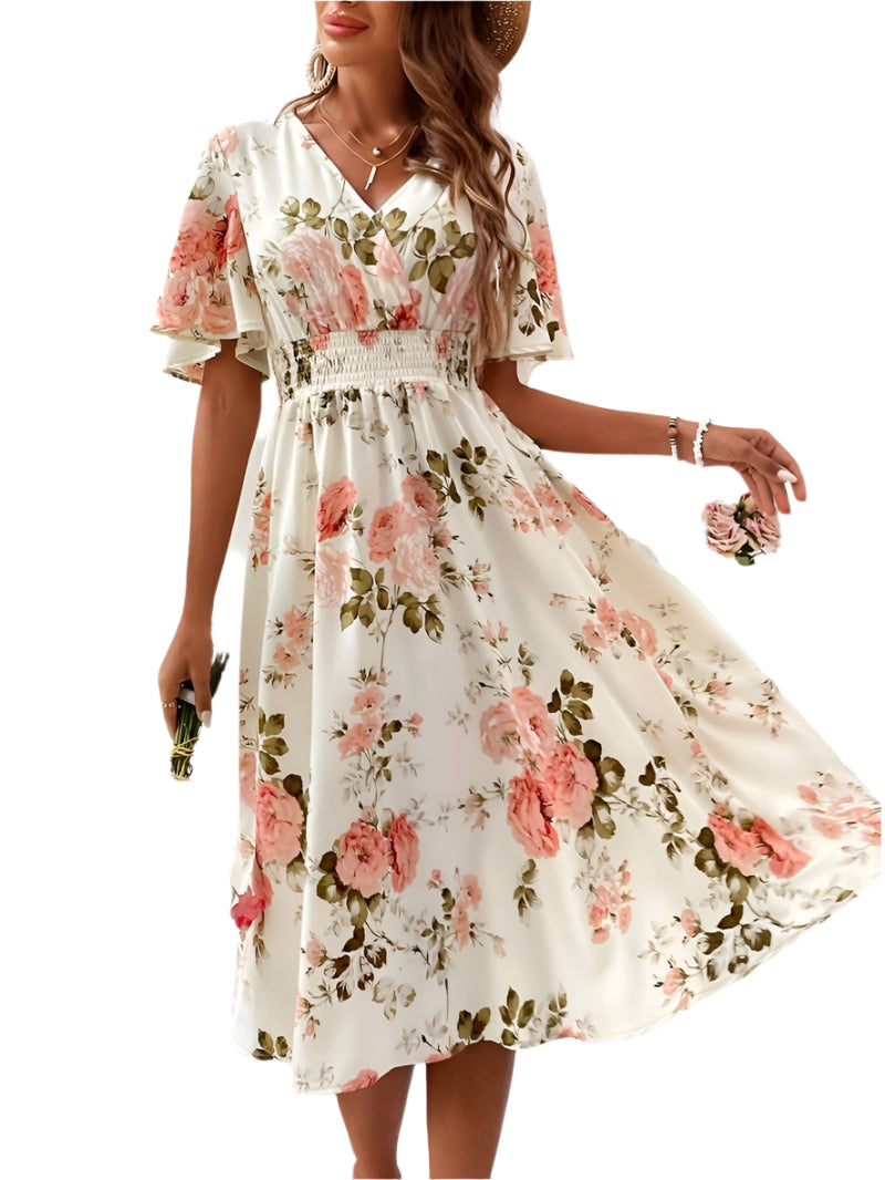 Kjolen har en smuk V-hals og delikate bølger, der giver et sofistikeret udtryk. Den er perfekt til både festlige lejligheder og hverdagsbrug, hvilket gør den til et alsidigt valg i din garderobe.