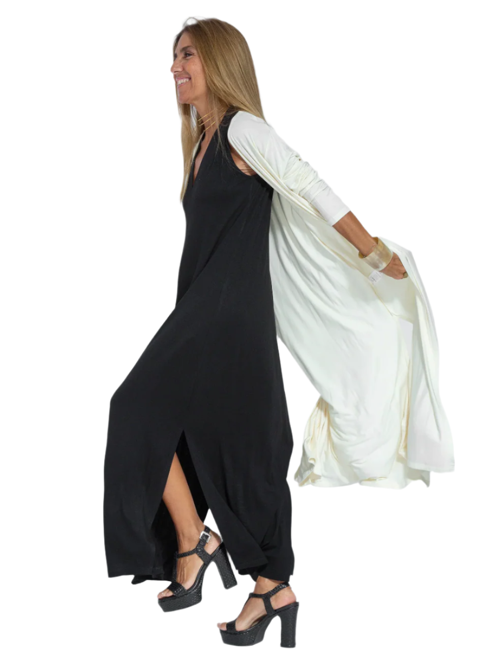 Oplev den perfekte kombination af stil og komfort med denne lange kjole og vest. Uanset anledningen vil du føle dig selvsikker og elegant, når du bærer dette sæt.