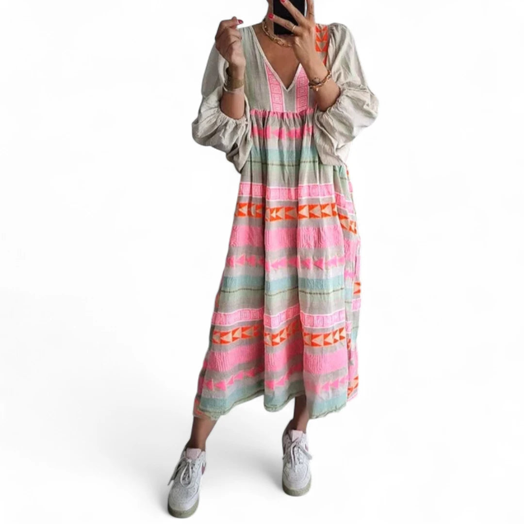 Helene sommerkjolen er designet med fokus på elegance og alsidighed. Den lange kjole med livlige farver og mønstre giver et friskt og festligt udtryk, der passer til enhver anledning.