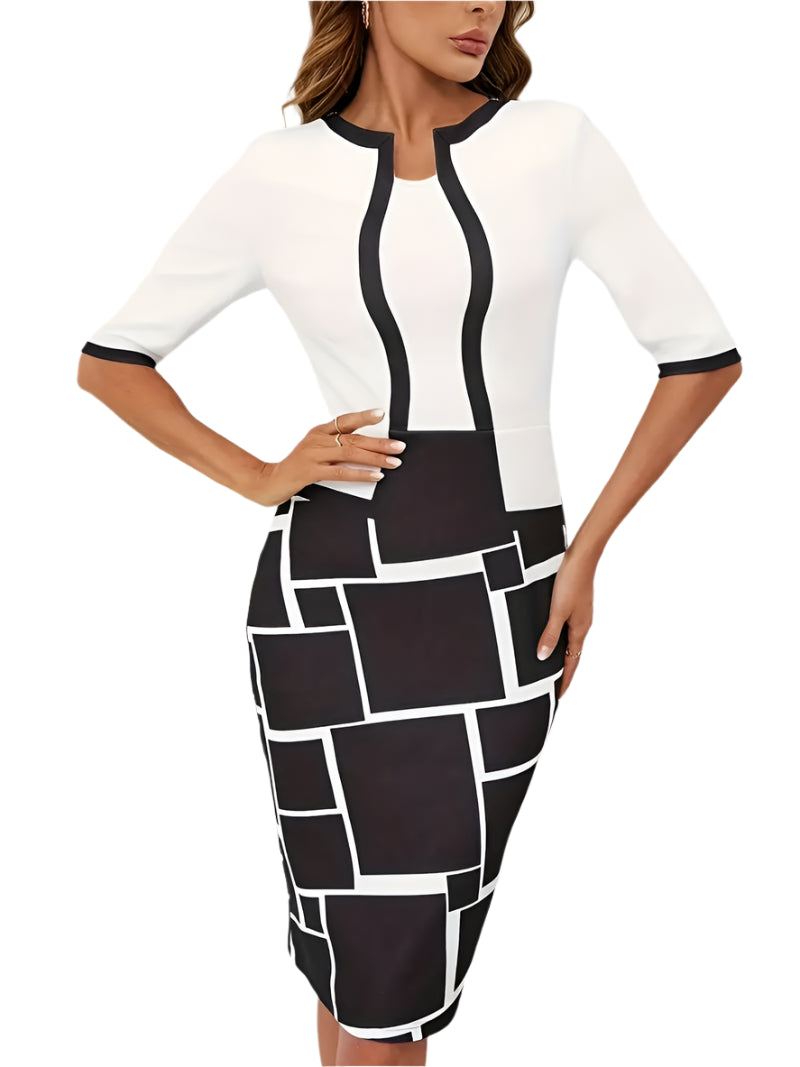 Oplev den perfekte kombination af stil og alsidighed med denne to-i-én kjole. Den moderne geo-print tilføjer et friskt pust, mens den runde halslinje giver et tidløst udtryk.