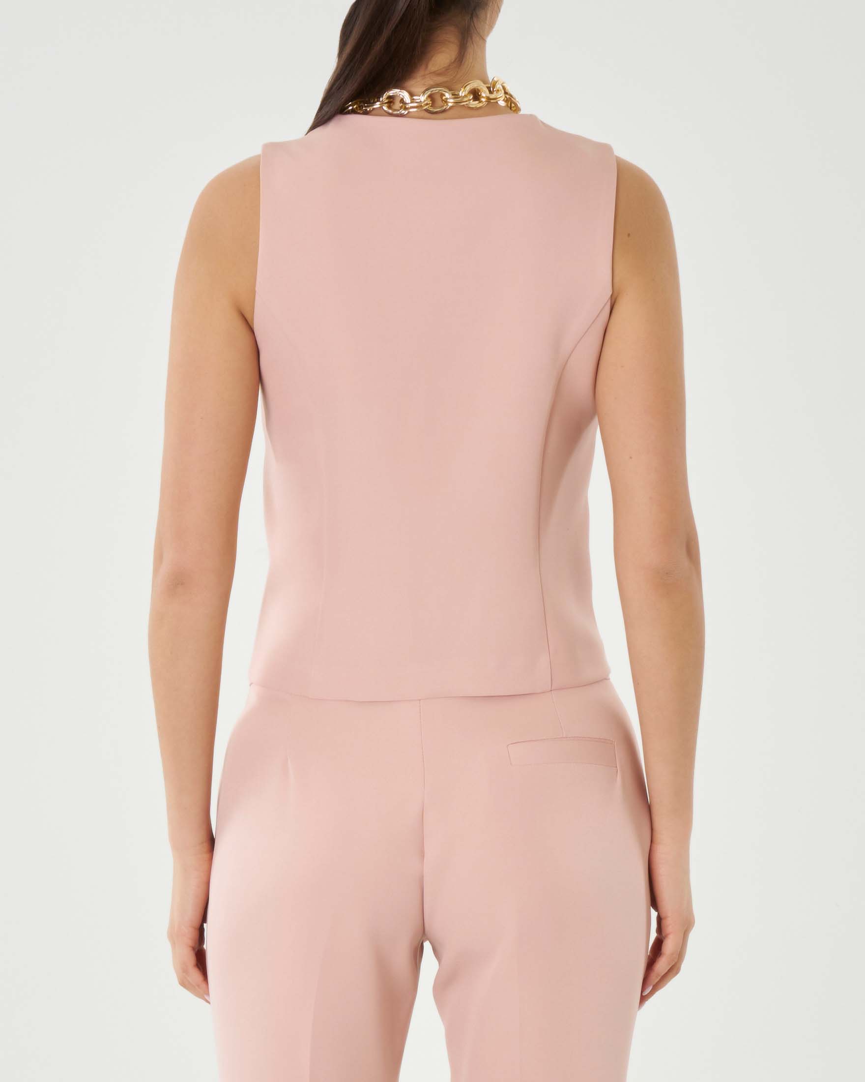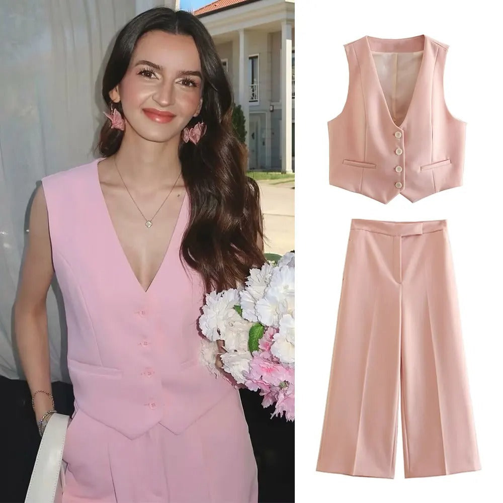 Træd ind i tidløs elegance med vores todelte pink buksedragtsæt. Dette vintageinspirerede sæt består af en smart tankvest med V-udskæring og enkeltradet knapdetalje, parret med bukser med lige ben for et strømlinet look.