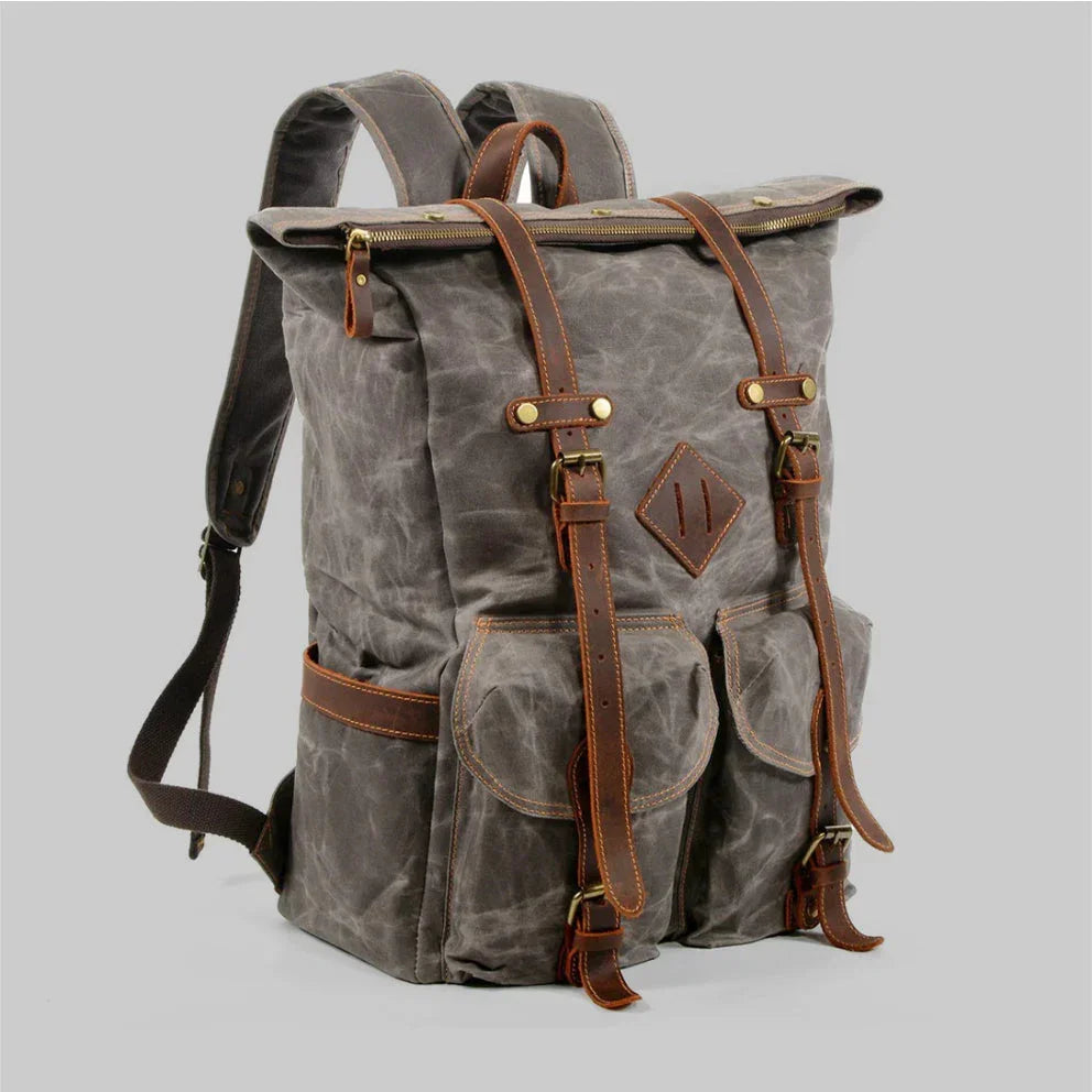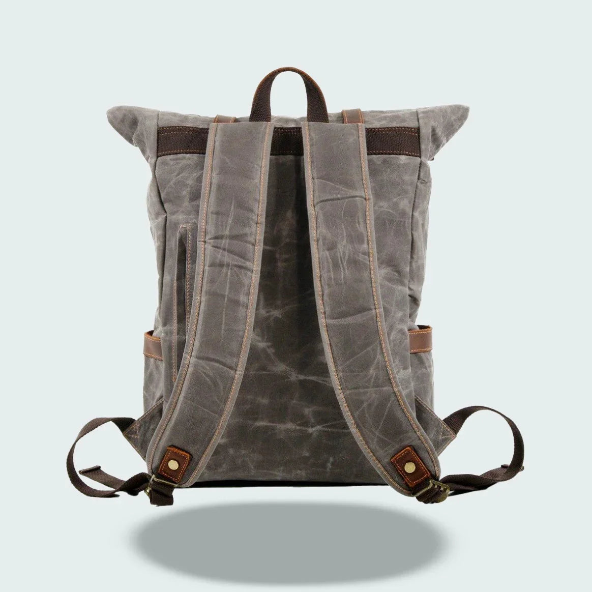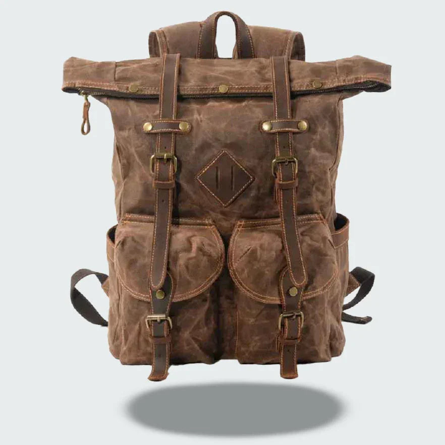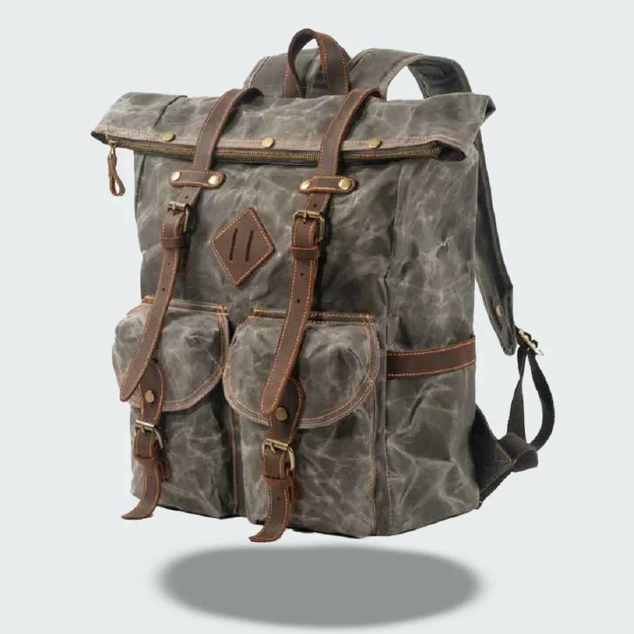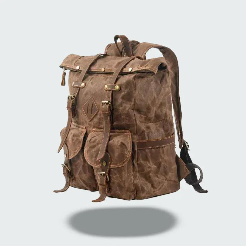 Med sit tidløse design og robuste materialer, herunder vandtæt olievokset lærred og ægte okselæder, er denne rygsæk både holdbar og stilfuld. Den unikke patina, der udvikles over tid, gør den til et personligt statement, der vokser med dig. Roll-top-lukningen giver mulighed for fleksibel opbevaring, så du kan tilpasse størrelsen efter behov.