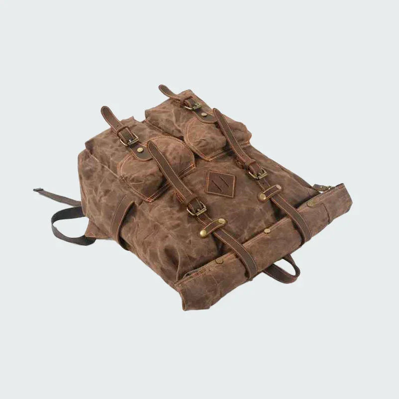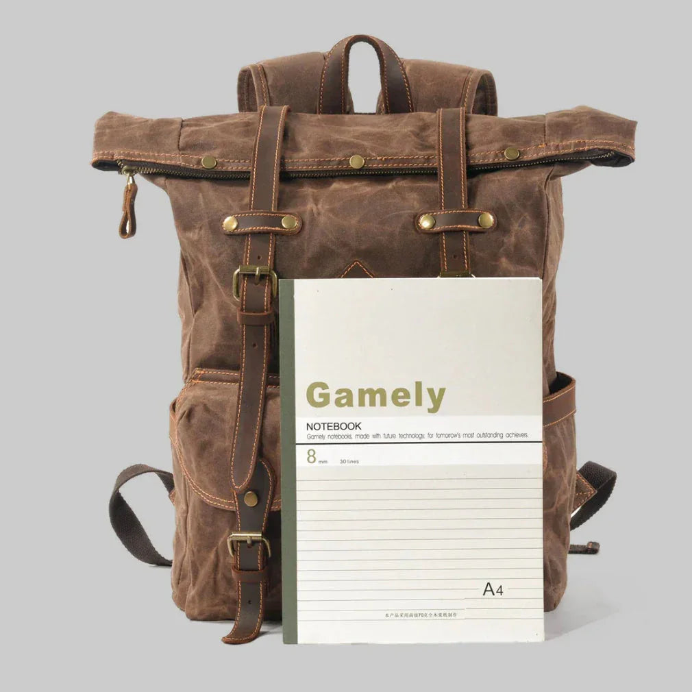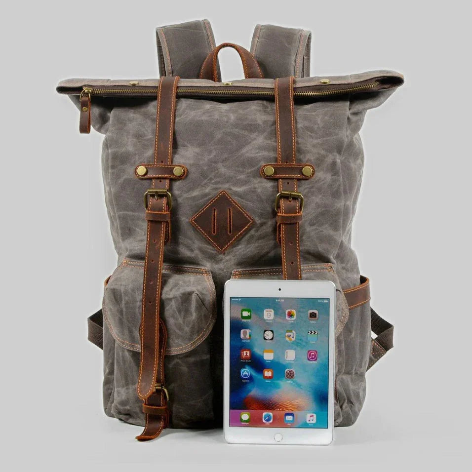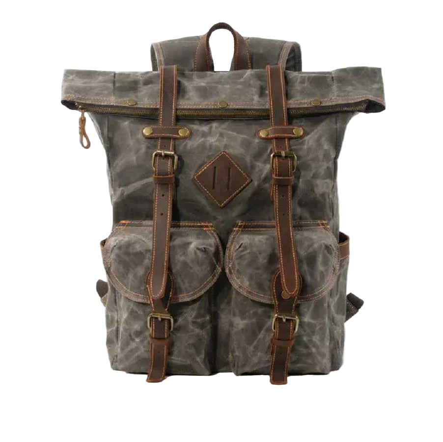 Med sit tidløse design og robuste materialer, herunder vandtæt olievokset lærred og ægte okselæder, er denne rygsæk både holdbar og stilfuld. Den unikke patina, der udvikles over tid, gør den til et personligt statement, der vokser med dig. Roll-top-lukningen giver mulighed for fleksibel opbevaring, så du kan tilpasse størrelsen efter behov.