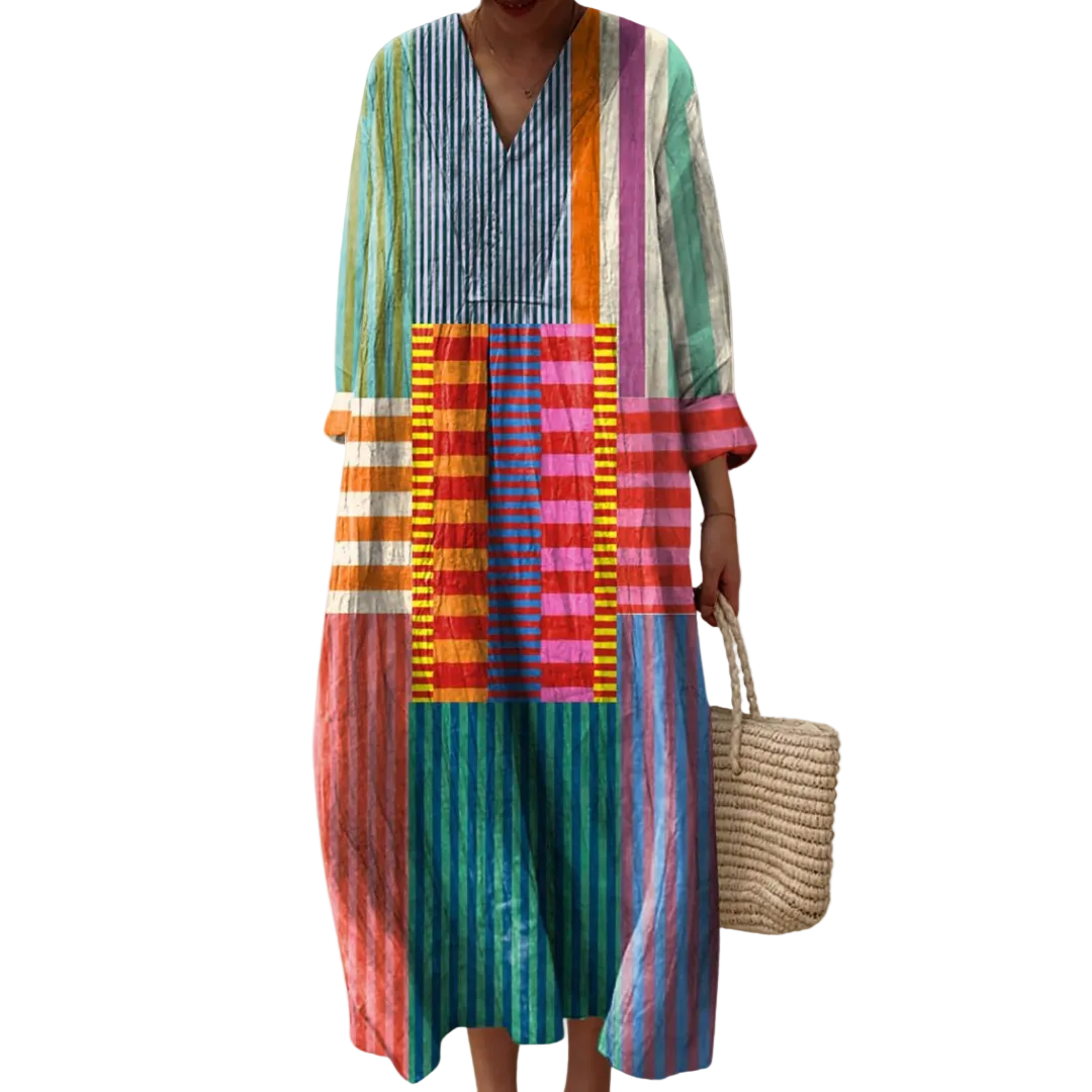 Oplev skønheden ved vores geometriske kjole, der kombinerer stil og komfort. Denne kjole er perfekt til at fremhæve din personlighed, uanset om du nyder en solrig dag eller en kølig aften.
