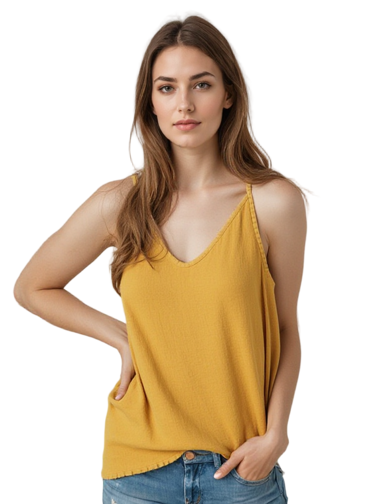 Toppen har et enkelt, men stilfuldt design med en afslappet pasform og spaghetti stropper, hvilket gør den ideel til både afslappede og mere formelle sommerbegivenheder. Det lette og åndbare materiale sikrer, at du føler dig godt tilpas hele dagen.
