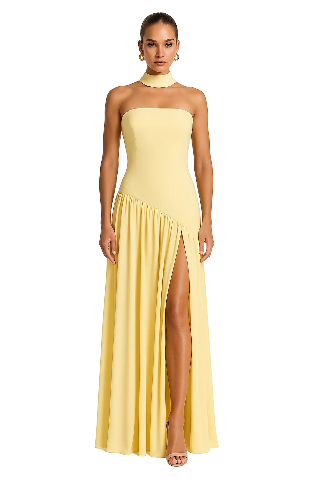 Kjolen er designet med en ren stropløs halsudskæring, der fremhæver skuldrene, og den flydende maxi-længde giver et poleret look. Slidsdetaljen tilføjer en yndefuld bevægelse, hvilket gør det nemt at style med hæle eller minimalistisk tilbehør til aftenarrangementer.