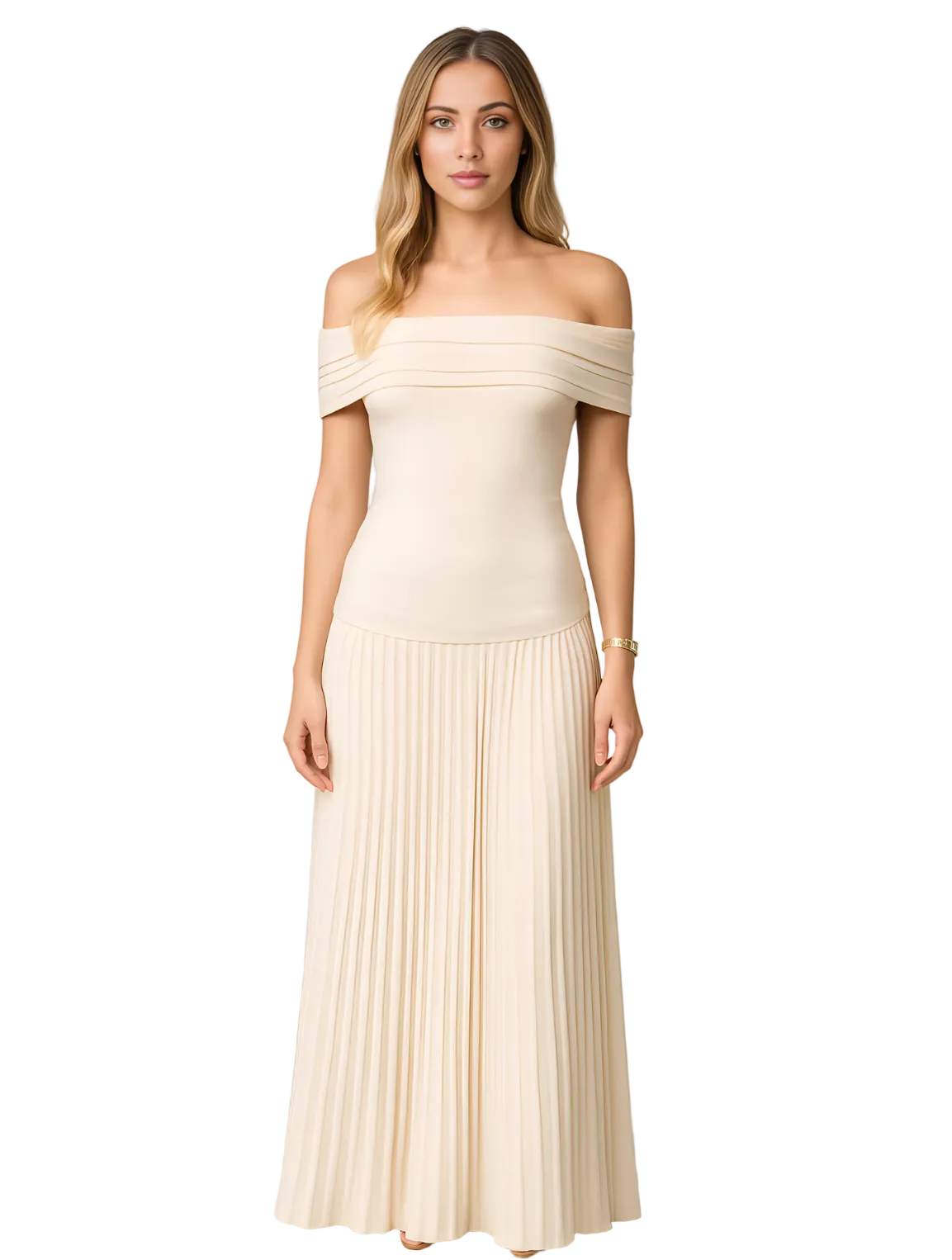 Træd ind i et yndefuldt, begivenhedsklart look med denne plisserede maxikjole. Det plisserede design tilføjer bevægelse og en sofistikeret finish, hvilket gør det til et smukt valg til ceremonier, receptioner og aftenfester.