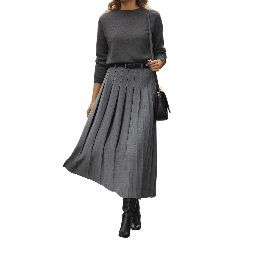 Opfrisk din garderobe med en nederdel, der blander raffineret charme og hverdagens alsidighed. Denne plisserede midi-nederdel har en flydende silhuet designet til at bevæge sig smukt med hvert skridt.