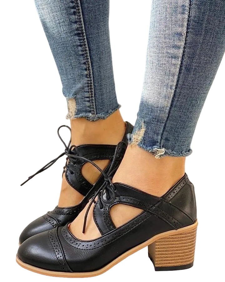 Disse sko har et klassisk T-rem design, der tilføjer et vintage-inspireret touch til dit outfit. Den moderate hælhøjde sikrer, at du kan bære dem hele dagen uden ubehag, mens snørelukningen giver en sikker og justerbar pasform.