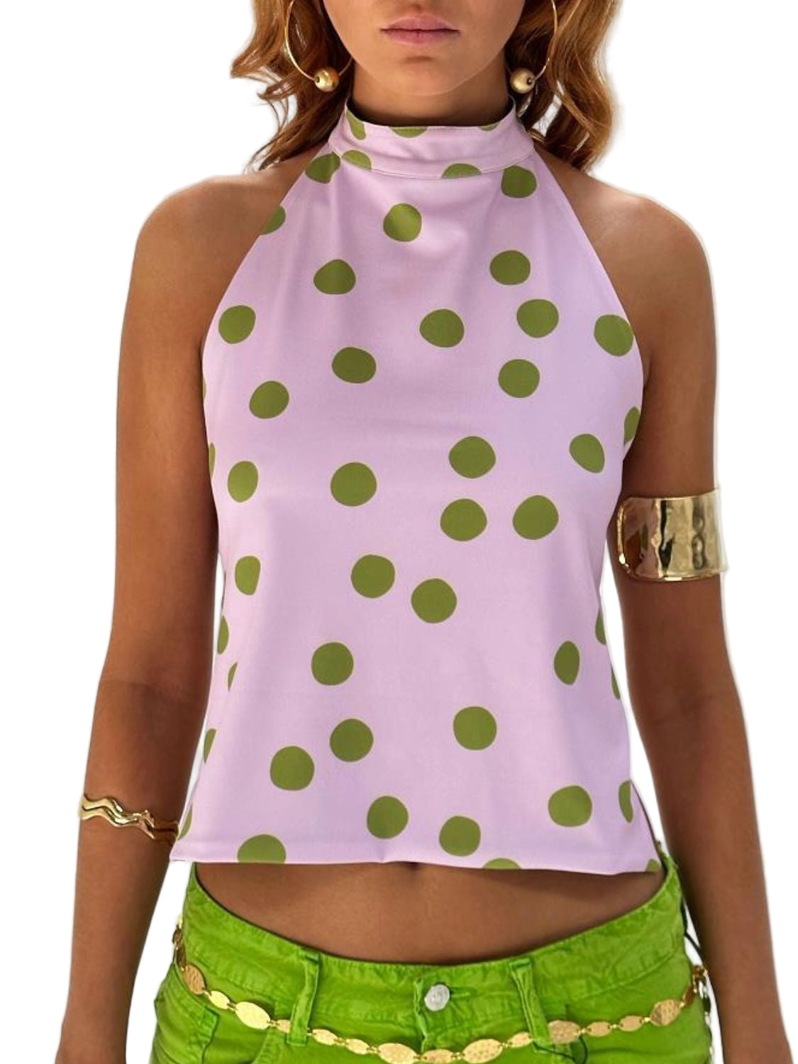 Dens unikke trykte design skaber et iøjnefaldende udtryk, mens den rygfri konstruktion og halterneck-detaljen sikrer, at du vender hoveder, uanset hvor du går. Ideel til varme udendørs aktiviteter eller afslappede begivenheder, bringer dette stykke en frisk og livlig energi til din garderobe.