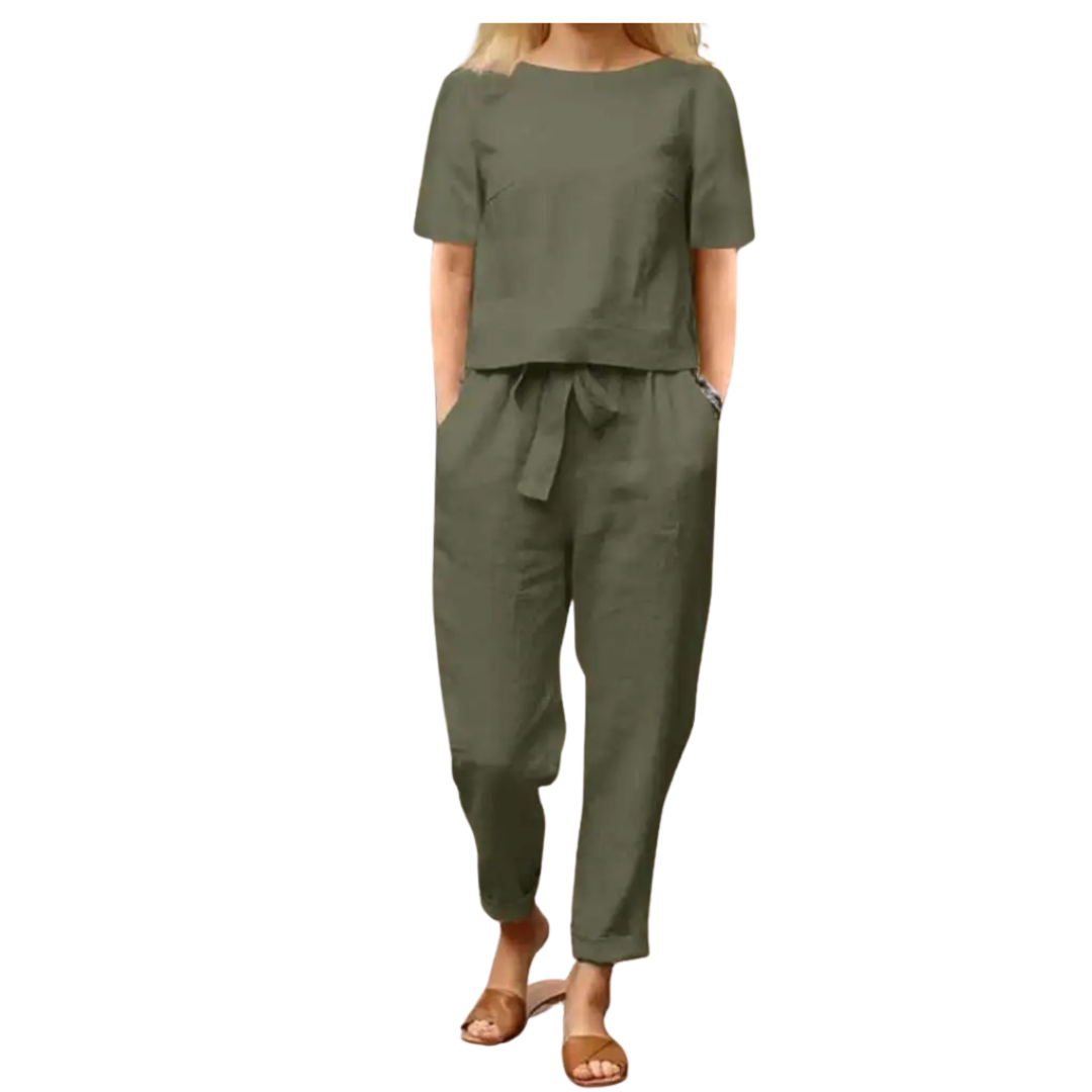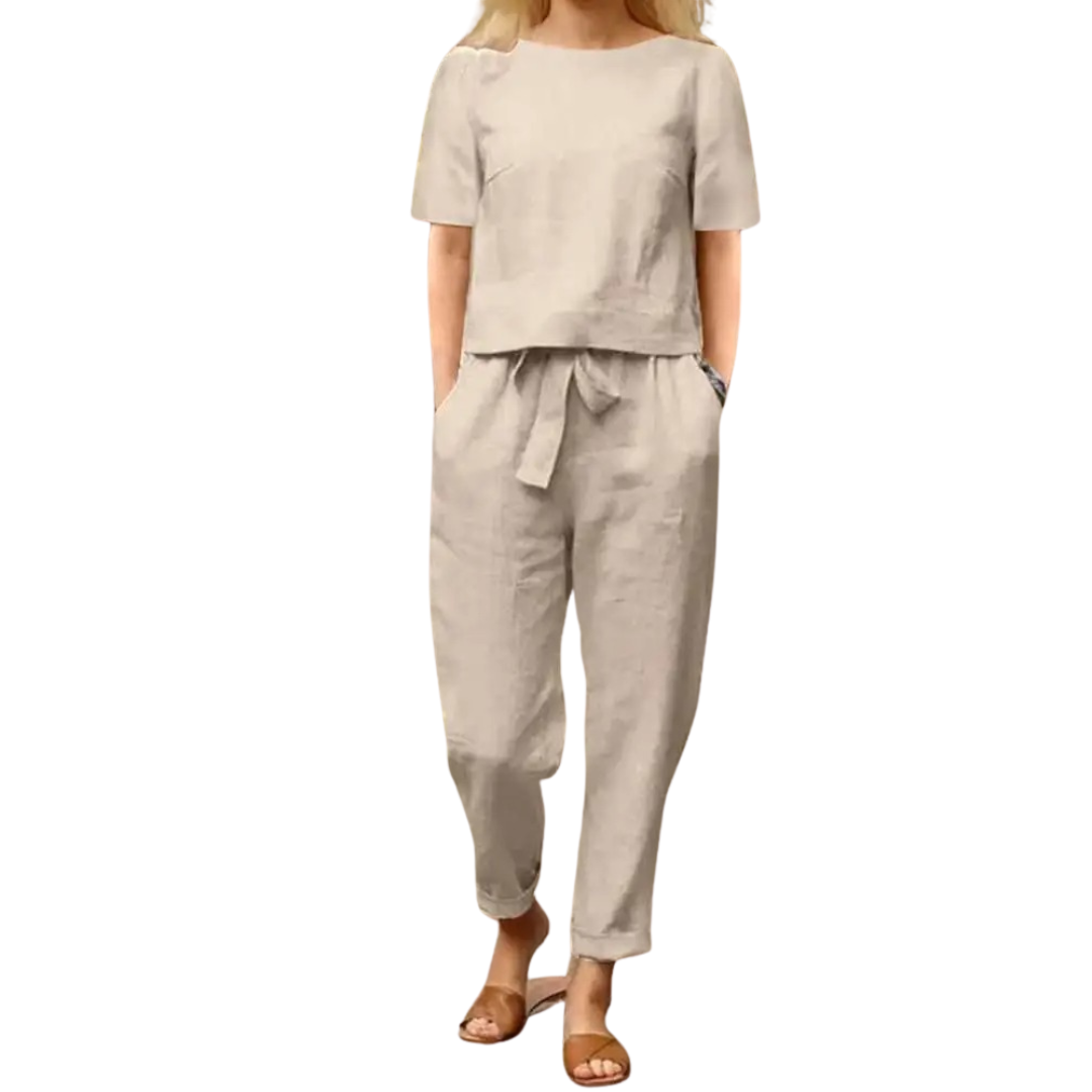 Vores træningssæt er fremstillet af materialer af høj kvalitet og sikrer holdbarhed uden at gå på kompromis med blødheden. Den kortærmede bluse giver en luftig fornemmelse, der er ideel til varmere dage, mens haremsbukserne giver et moderne twist med deres afslappede, men smarte silhuet.